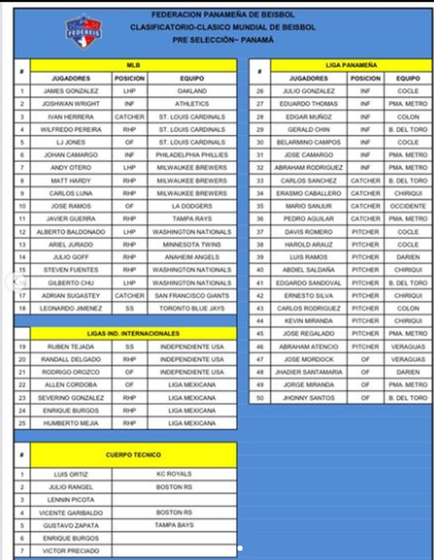 La Federación Panameña de Béisbol (Fedebeis) anunció en sus redes sociales un listado con la preselección de Panamá con miras a la eliminatoria del Clásico Mundial.