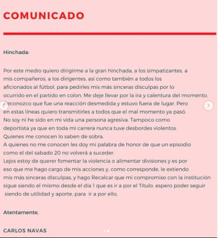 El mediocampista panameño, Carlos Navas, publicó en sus redes sociales una disculpa principalmente para los fanáticos de su equipo, el San Francisco FC, tras incidentes este sábado 20 de agosto ante el Árabe Unido de Colón por la J5 de la LPF.