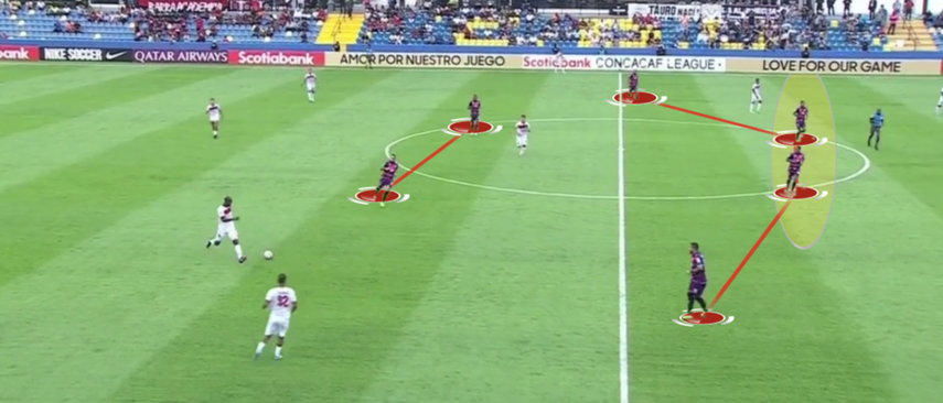 · Todo lo comentado anteriormente es consecuente a la postura y nulidad en la presión de Tauro. Los taurinos se vieron con problemas a la hora de sostener su bloque medio porque los pivotes no acompañaban sobre la línea de delanteros, quedándose siempre atrás, más comprimidos sobre la última línea. Solamente saltaban si se llegaban a asomar los extremos en posiciones internas. Pero estaban más pendientes de protegerse la espalda que de cortar el juego de los mediocentros contarios. Esto significó perder dominio, territorio y hundirse contra su área. (Imágenes de ejemplo abajo)