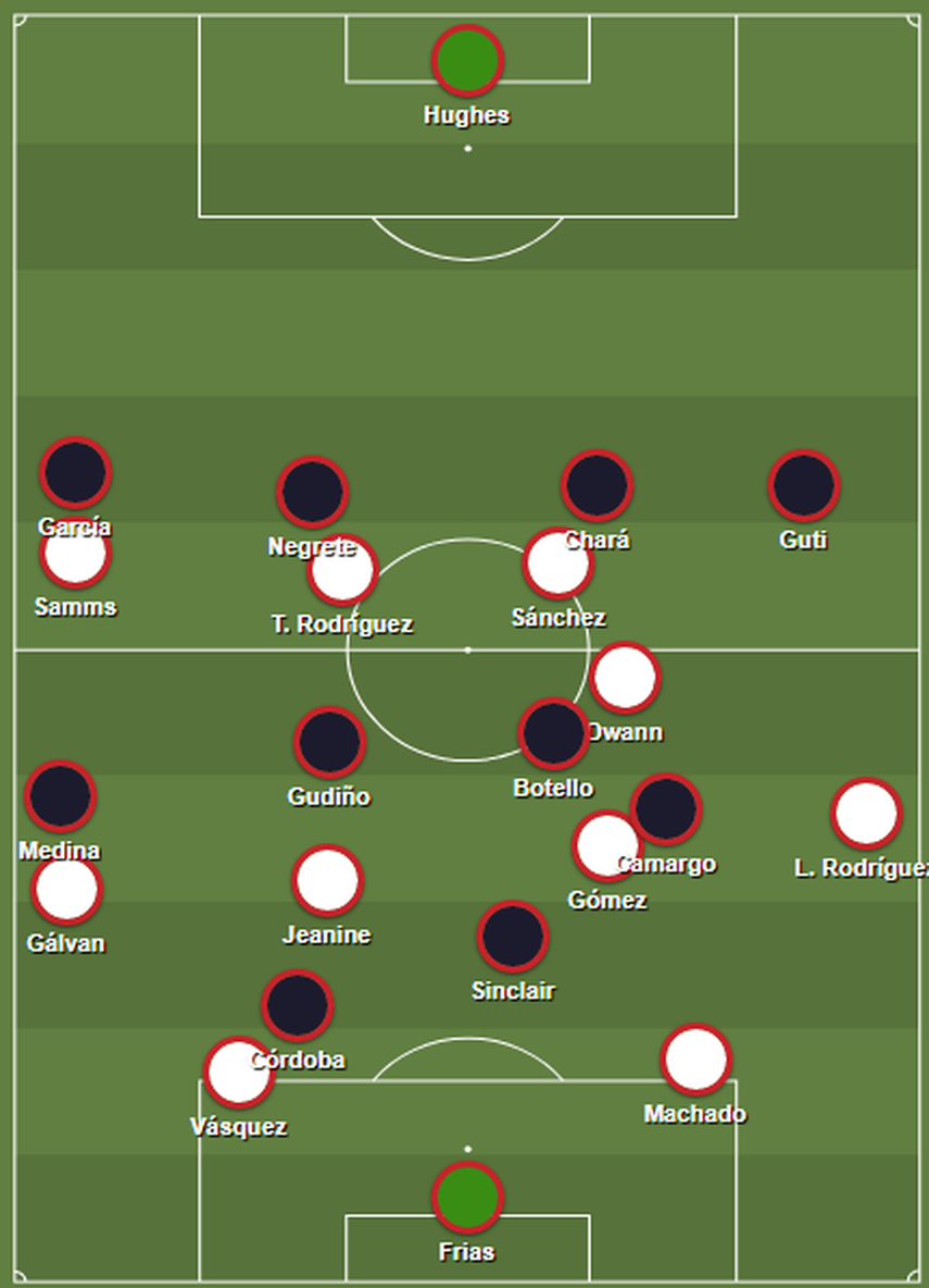 Desde los primeros minutos se pudo apreciar que Tauro ya no saldría con la premisa de presionar para entorpecer cualquier situación de avance del contrario. De hecho, el equipo se situaría un tanto por detrás de la divisoria, siendo los dos puntas, los únicos que rebasarían el circulo central. El plan era robar desde esa zona y transitar desde ahí, jugando con la urgencia de los rojinegros por tener el marcador en contra.