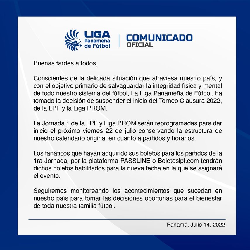 La Liga Panameña de Fútbol (LPF) ha tomado la decisión de suspender el inicio del Torneo Clausura 2022, de la LPF y la Liga PROM, conscientes de la delicada situación que atraviesa nuestro país, y con el objetivo primario de salvaguardar la integridad física y mental de todo nuestro sistema del fútbol,
