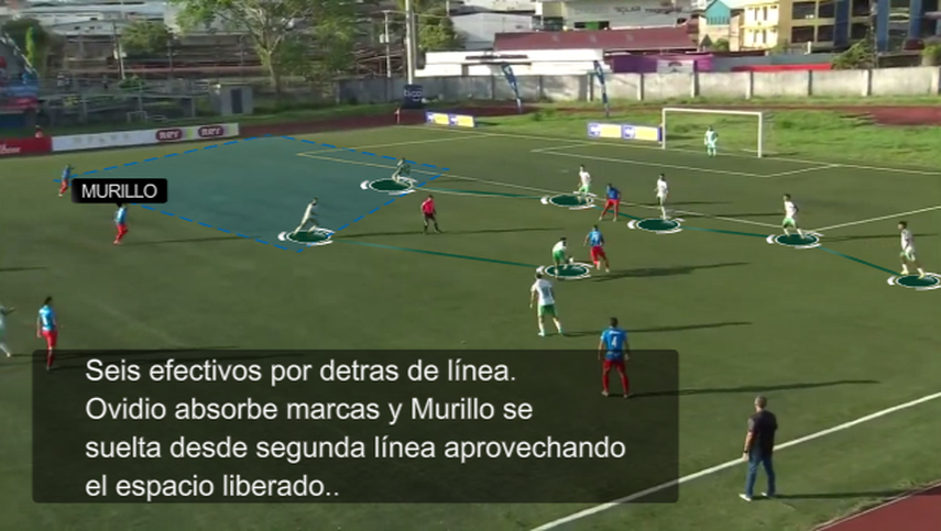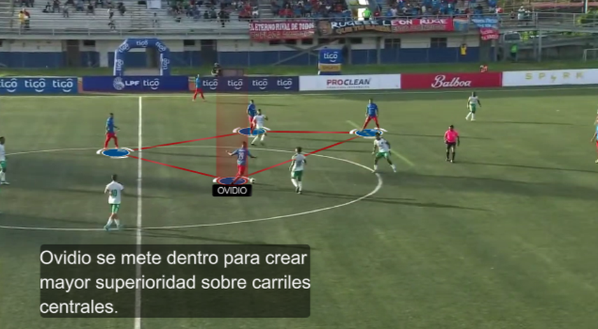 ¿Qué hicieron? El 6 se quedó mas retrasado como soporte y bisagra para cerrar transiciones, y también para limpiar desde el primer pase la salida. Este matiz ayudó a que los laterales se proyectaran. Ovidio, por su parte, fue una pieza importante para descongestionar, sobre todo a través del regate y la conducción; igualmente incrustándose en el medio para ser una vía por detrás o a costados de los pivotes aliancistas.