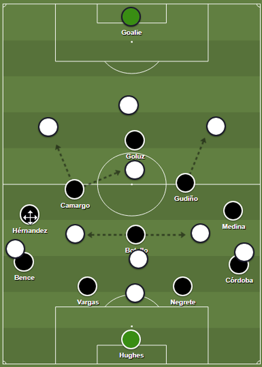 Todo este sistema defensivo con tantos cuerpos hundidos no habría funcionado sin Goluz, llave de cada transición. El Tauro lo uso como via de escape y oxigeno, también como el puntal más dañino cuando se recuperara. Los interiores, Gudiño y Camargo, amén de colaborar en los duelos o aguantar cargas rivales para tocar de cara si el equipo robaba, se mantuvieron levemente descolgados. Los Taurinos sumaron varias jugadas de peligro mediante esto.